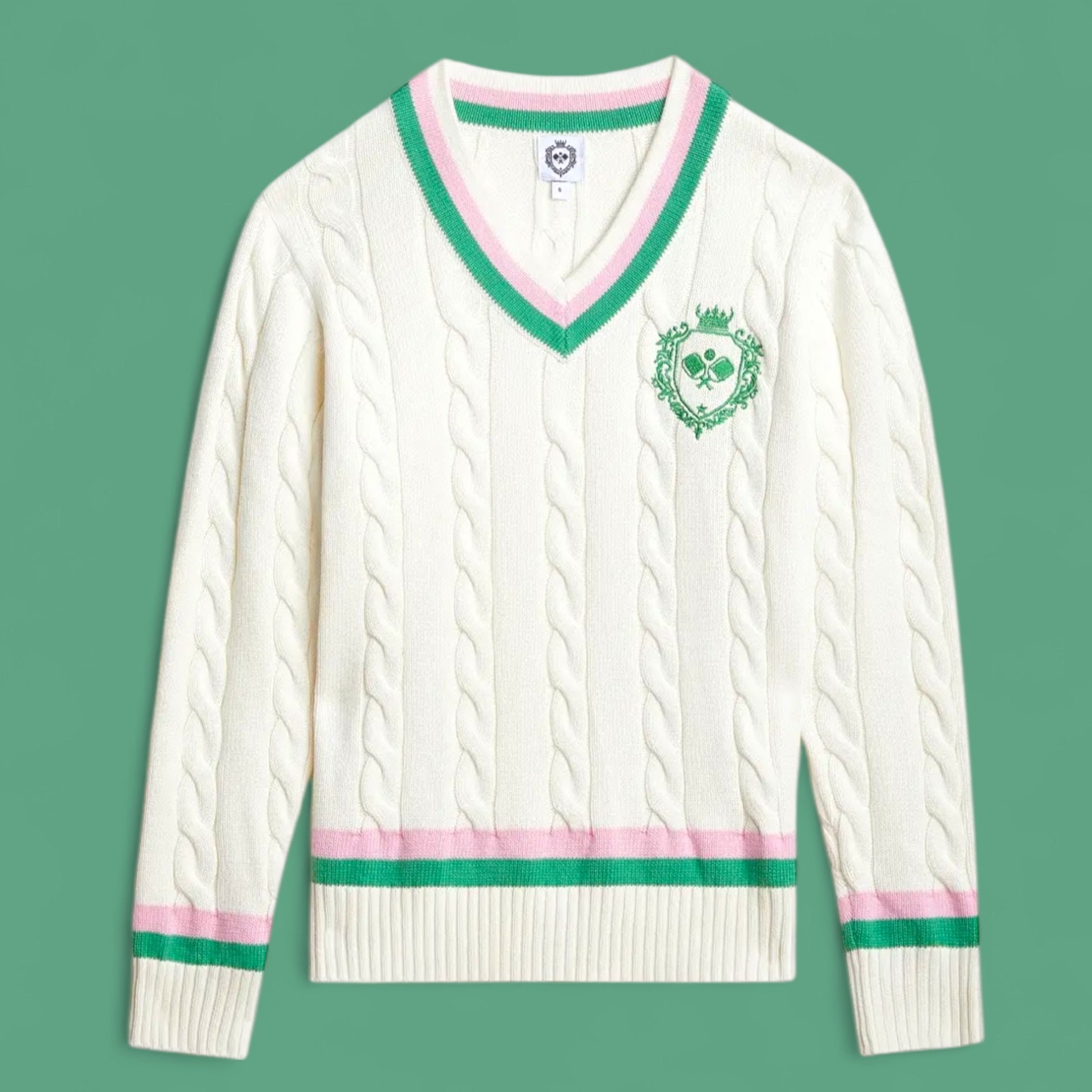 Crafted from 100% cotton, this sweater features an embroidered pickleball logo, accented with pink and green details.