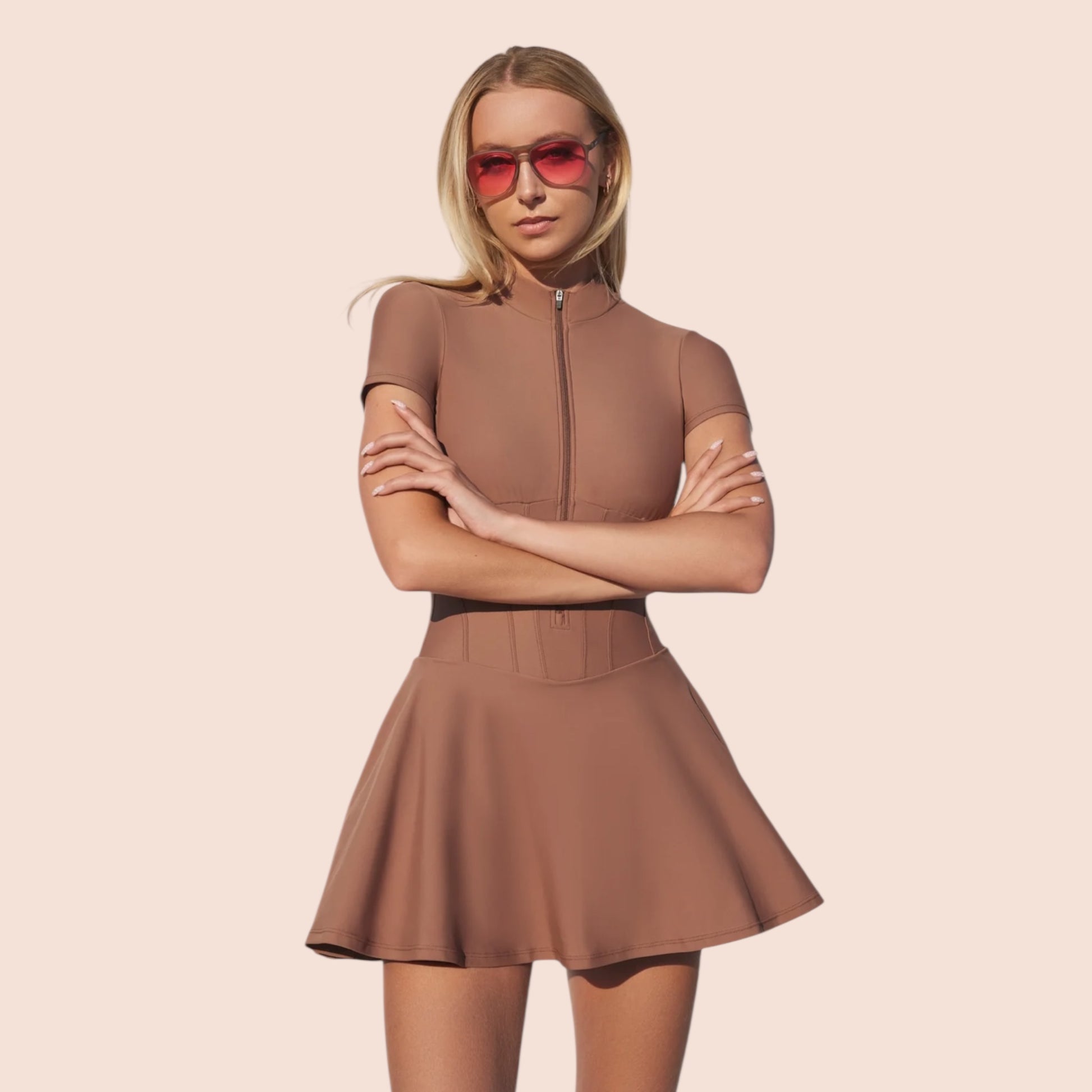 The Vienna Dress is a timeless take on sport-luxury - sleek, sculpted & designed for athletes who prefer a more covered, refined look. With filled-in corset-inspired paneling, a new & updated low-zip for ease of entry and exit, zip-up or down front, & a slightly longer hemline, it brings effortless class to any court or clubhouse. Built-in shorts, discreet ball pockets, & a structured silhouette make this a go-to for movement without compromise.